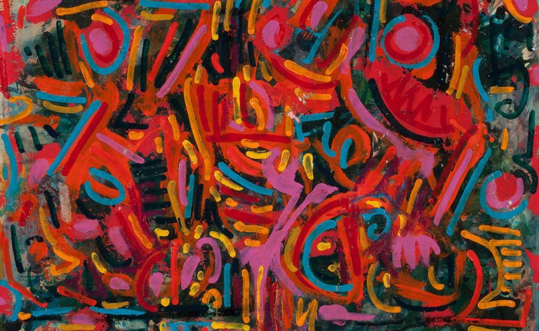 David Clyde Driskell (American, 1931 – 2020), “Masks,” 1988. Tempera and encaustic on paper, 19 × 25 inches. Georgia Museum of Art, University of Georgia; The Larry D. and Brenda A. Thompson Collection of African American Art. GMOA 2012.121.
