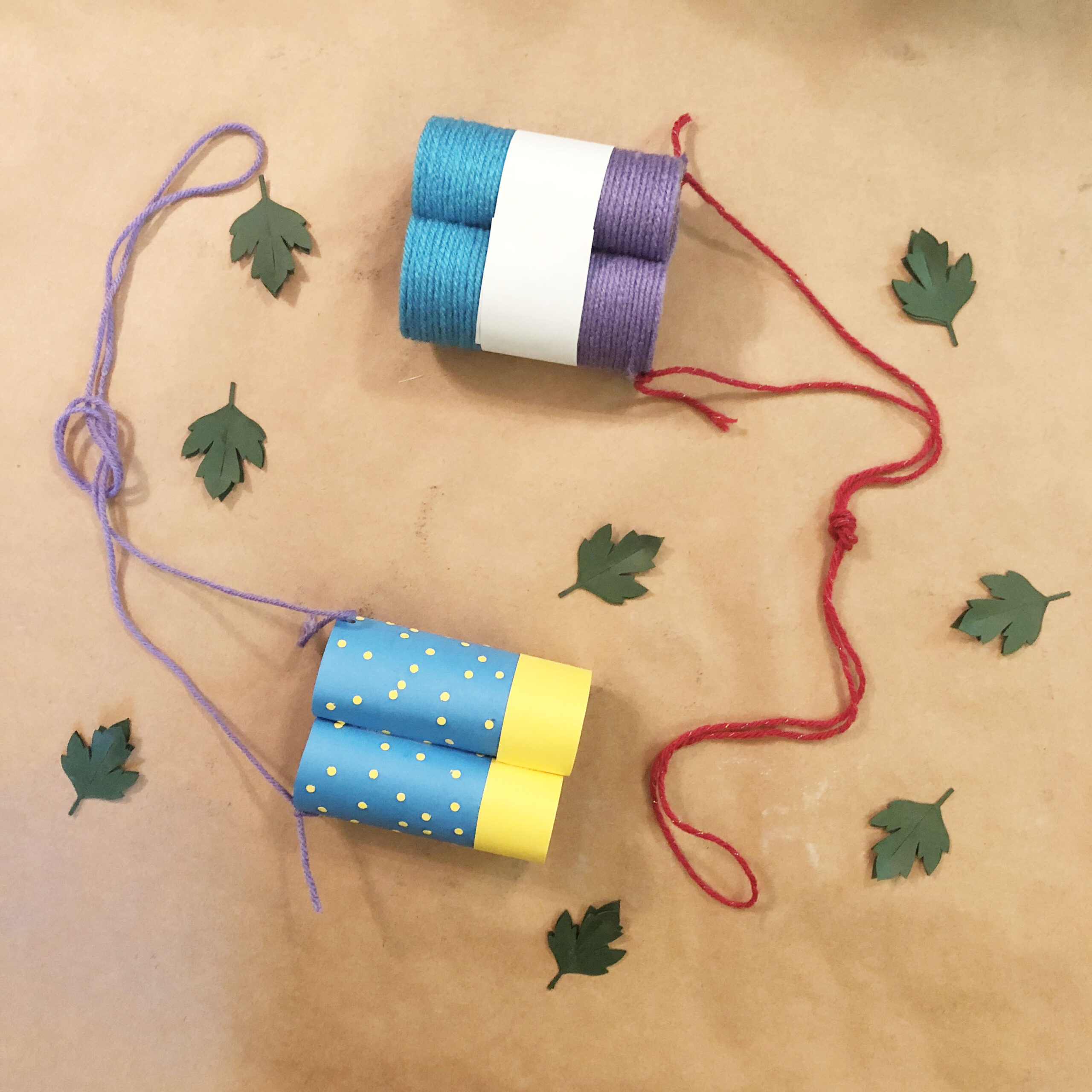 - Use a hole punch (or scissors) to add a hole to the outside of each tube. String a long piece of yarn or string through the holes to create a strap. This will let you hang the binoculars around your neck.