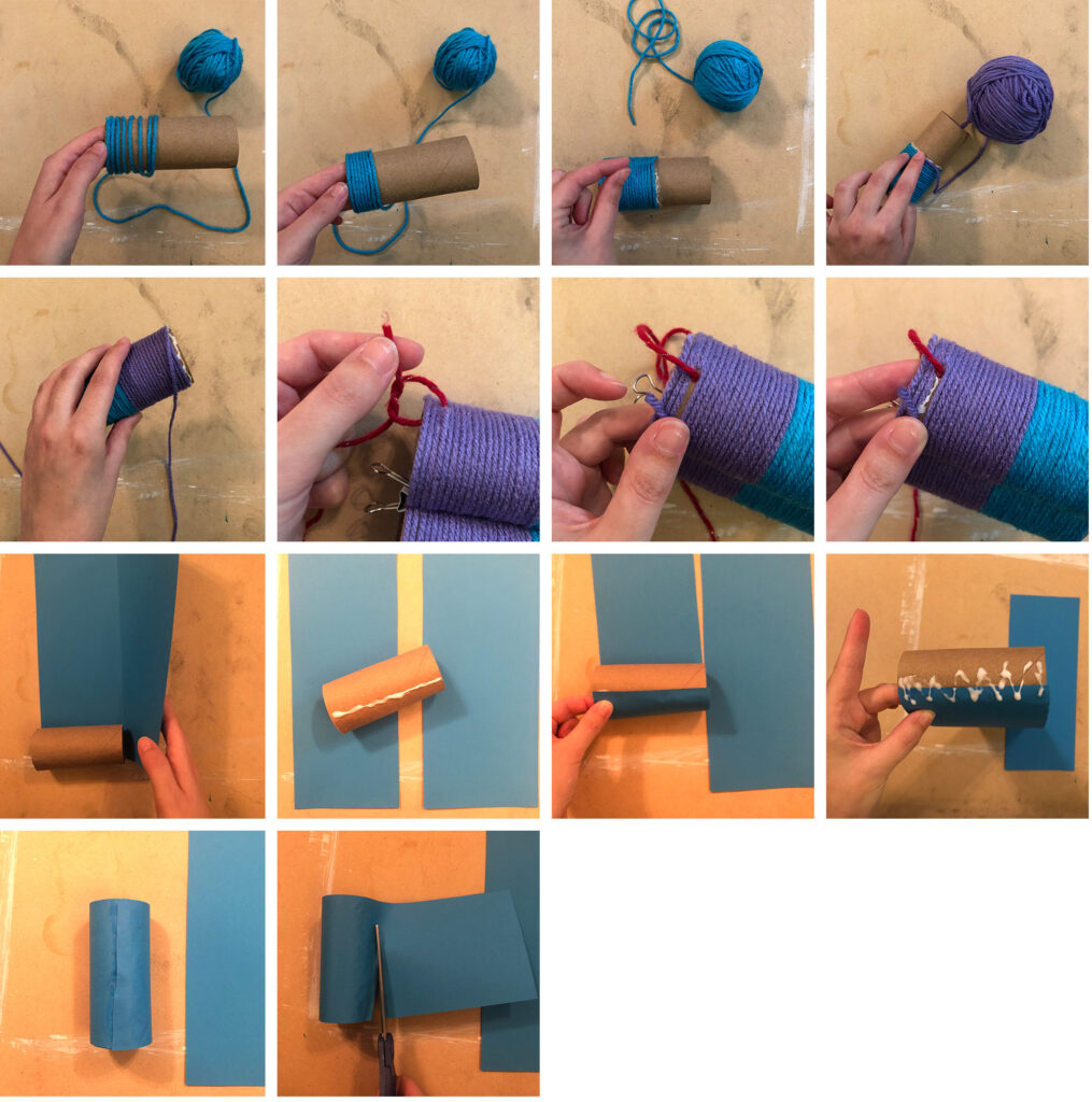 - Repeat step 1 with different widths of colored paper to create stripes. Or wrap your toilet paper tubes in yarn. Glue one end of the yarn down and wrap it around the tube, then glue the other end. You can use several different colors if you want.