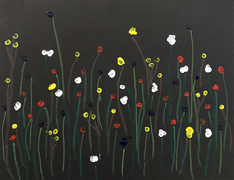 - Dip the Q-tips into your paint. Use them to create dots of color at the end of each stem. These are your flowers!