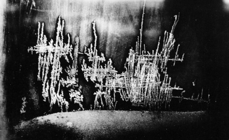 Joseph Breitenbach (estadounidense, n. Alemania, 1896 – 1984), “El invierno escribe en una ventana del ferrocarril” (“Winter Writes on a Railroad Window”), 1951. Impresión al carbón con tinta blanca. 5 1/2 × 4 1/8 pulgadas. Georgia Museum of Art, University of Georgia; Regalo de Jordan Massee. GMOA 1996.186