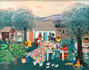 Take a look at this painting by Pris Butler called “Quilting Scene.” What is the weather like in this painting? How can you tell? What are the people doing outside? Do you like to play outside when it’s sunny? You can go swimming, blow bubbles and play at the park. Buttler is a self-taught artist who paints colorful scenes of everyday life.