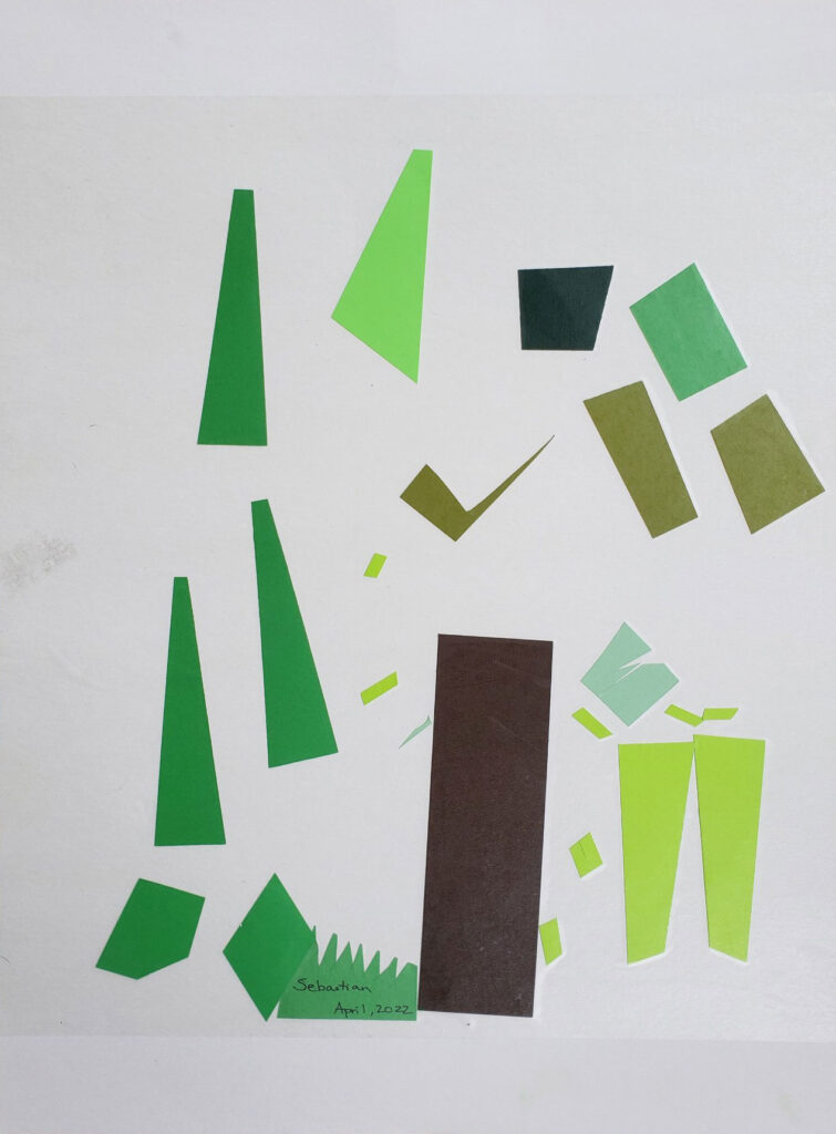 - To prepare, cut a long rectangle of brown paper and lots of smaller pieces of green paper. Leave some long strips of green so your little artist can practice cutting out their own “leaves.”