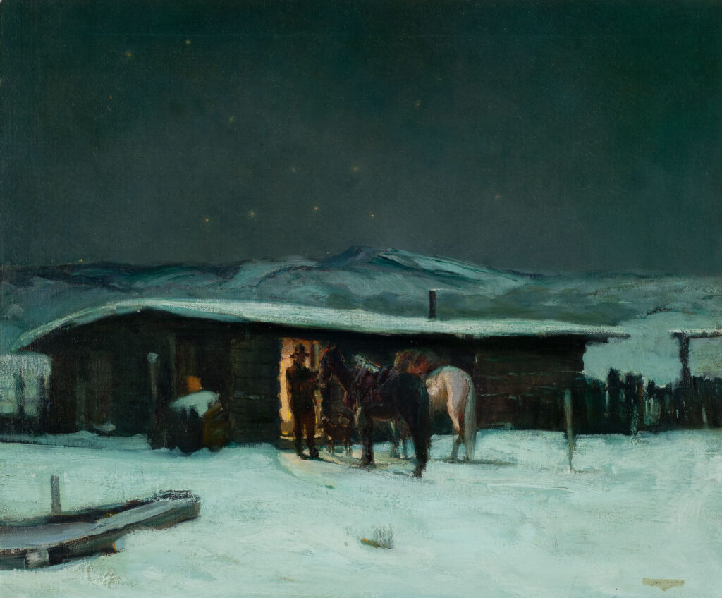 This painting, “Ranch Cabin, Starry Night, Taos,” is by the artist Oscar Edmund Berninghaus. It shows a small cabin in a snowy landscape. What color is the snow? Is it morning or night? What animals do you see?