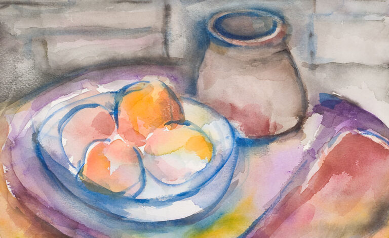 Alice Fischer (American, 1907 – 2004), “Still Life with Fruit and Vase,” n.d. Watercolor on paper. Georgia Museum of Art, University of Georgia; Gift of the estate of Alice Fischer. GMOA 2010.10.