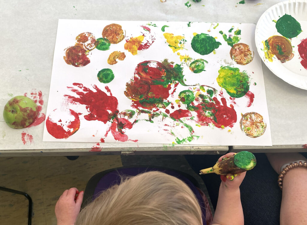 - Press fruit into the paint and then press paint-covered fruit on the paper.