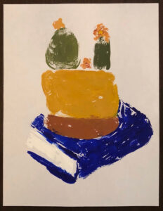 For this Art at Home activity, try working with a friend (in person or virtually)! Gather two to four different objects from your house, and then arrange them on a flat surface into an interesting formation. Make sure these objects have a variety of textures, shapes and colors. After you have positioned your objects, paint what you see. A painting, print or drawing that shows a group of positioned objects is called a still life.