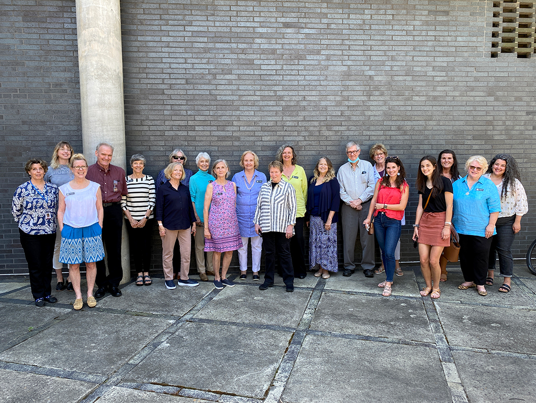 Docents of the Georgia Museum of Art pose for a photo with Emily Hogrefe-Ribeiro, assistant curator of education, and Sage Kincaid, associate curator of education, in the Jane and Harry Willson Sculpture Garden on May 17, 2021.