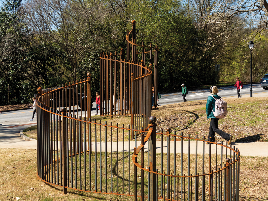 Crawford and his team installed “On the Verge” in November, just across from the museum’s Carlton Street covered parking area entrance. For a long time, it was just a series of large posts and it was hard to envision the final product, but the sculpture took shape rapidly as workers assembled sections of spiraling metal in between those posts. The result is a work that comes to life as students walk, bike or scoot through it, a passion project that differs substantively from the commercial work at which he excels. Although Crawford attended the Rhode Island School of Design (RISD), members of his family went to UGA, and he’s pleased to have one of his largest works of sculpture on its campus, where it and “Split” serve as gateways to the arts district.
