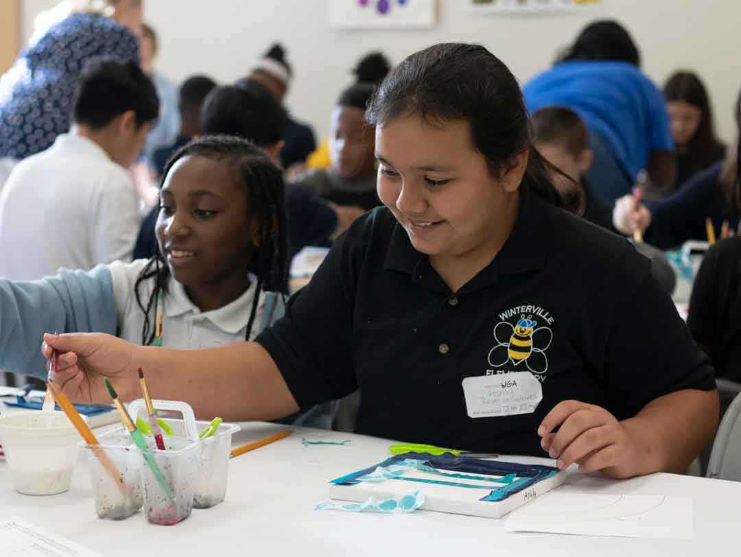 Every year, the Georgia Museum of Art organizes tours for every 5th-grade class in the Clarke County School District (CCSD), with generous private donors funding bus transportation and other costs. In 2019, 2,274 CCSD students from all 14 elementary schools toured the exhibition “Mary Lee Bendolph: Quilted Memories.”(opens in new tab)