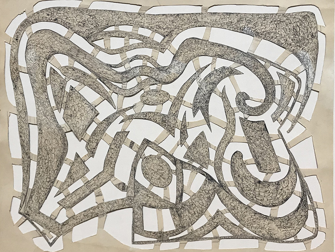 “El Orador” features a speaking figure with one arm raised, molded in a mixture of curved and jagged segments of scrap metal. “Proyecto para mural in distintos metales” is a preparatory study made from two distinct layers of cut paper. The study is not related to any known mural produced by Cueto.
