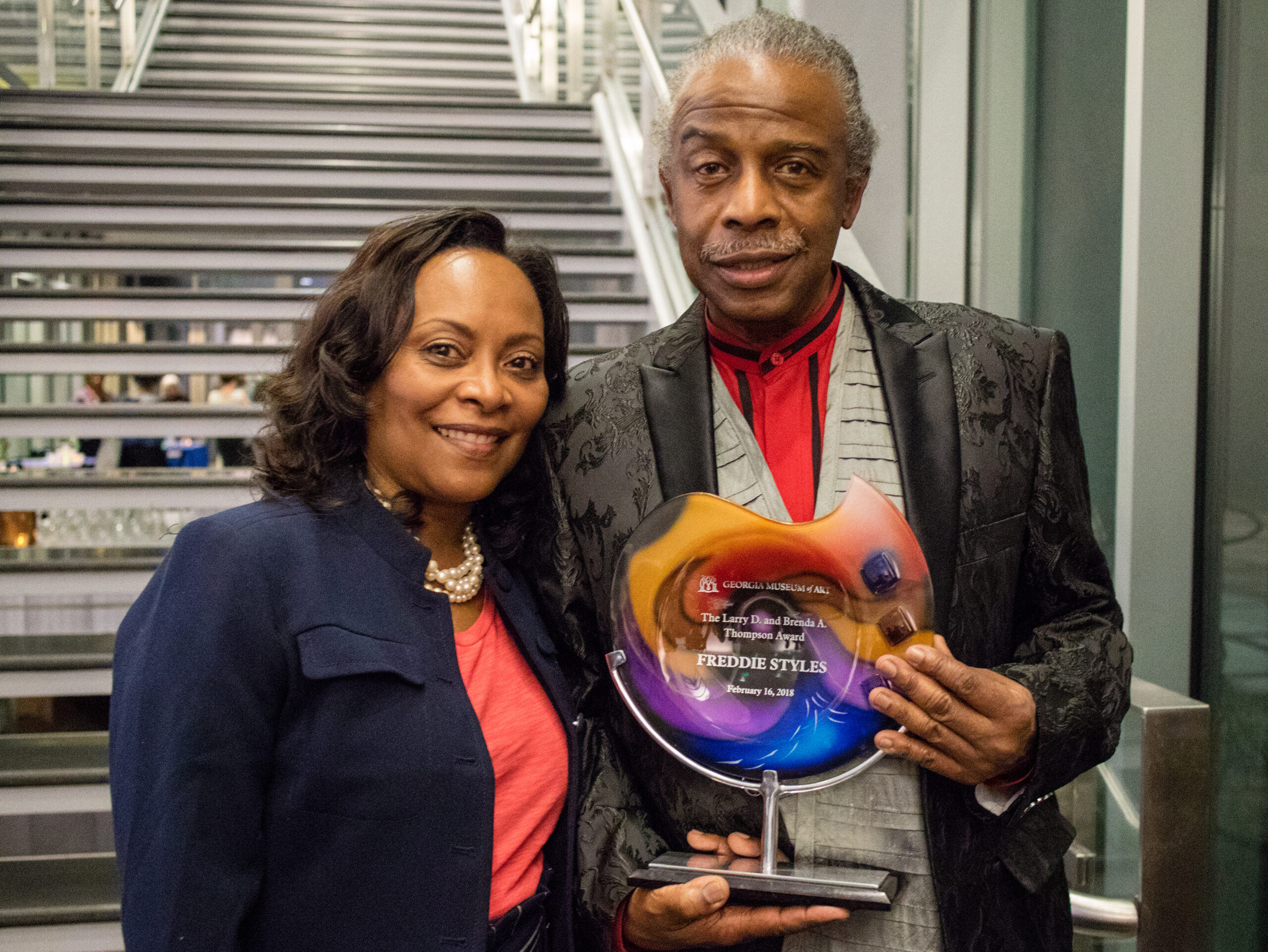 Freddie Styles received the Larry D. and Brenda A. Thompson Award for his efforts as an artist. This award is given annually to honor an African American artist who has made significant but often lesser-known contributions to the visual arts tradition and has roots in or major connections to the state of Georgia. It is named for the couple who donated 100 works by African American artists from their collection to the museum and endowed a curatorial position there (held by Shawnya L. Harris) to focus on art by African American and African artists. Larry Thompson teaches at the University of Georgia School of Law and is a UGA Foundation Trustee. Brenda Thompson is the current chair of the museum’s Board of Advisors.