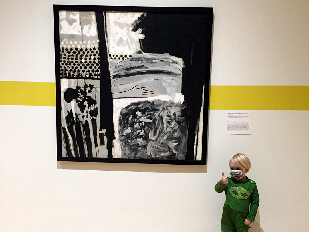 “First, we go to the elevator,” he said. And then he led me that way. He gleefully pushed the buttons, and when we got to the second floor, he took me the route that he and his dad took the day before. He asked a lot of questions, like, why was there a blond woman in blackface [an Emma Amos painting]? Why was there a woman holding up a black and white mask? Why was Martin Luther King Jr. there next to “an upside down guy” (Malcolm X)? I did my best to respond as honestly as I could, being as true as possible to the background information provided by the museum, while also trying to approach the concepts in a way a three-year-old might be able to follow.