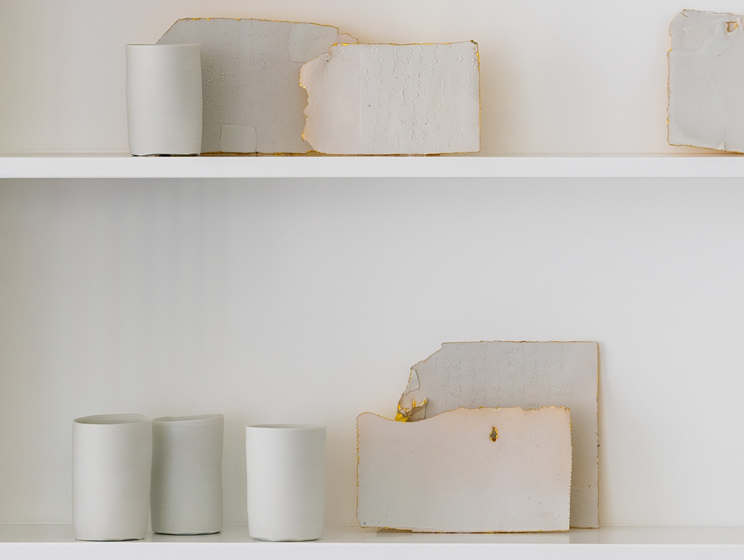 The “Letters to Amherst” series derives its title from poet Emily Dickinson, who spent her life in Amherst, Massachusetts. Dickinson was notoriously reclusive but corresponded at length with friends. Her poetry uses slant or imperfect rhymes, as well as frequent dashes, to break up words and lines. De Waal refers to her as “the poet of fracture.” She makes “spaces and connections between often very disparate feelings and emotions and images,” notes De Waal. In a similar way, his works use vessels and the spaces between them to make a sort of visual poem. The beauty of his objects, which often glow with gold and silver leaf, can seem removed from the world, but he says, “It’s possible to make things that are beautiful that also have guts to them.”