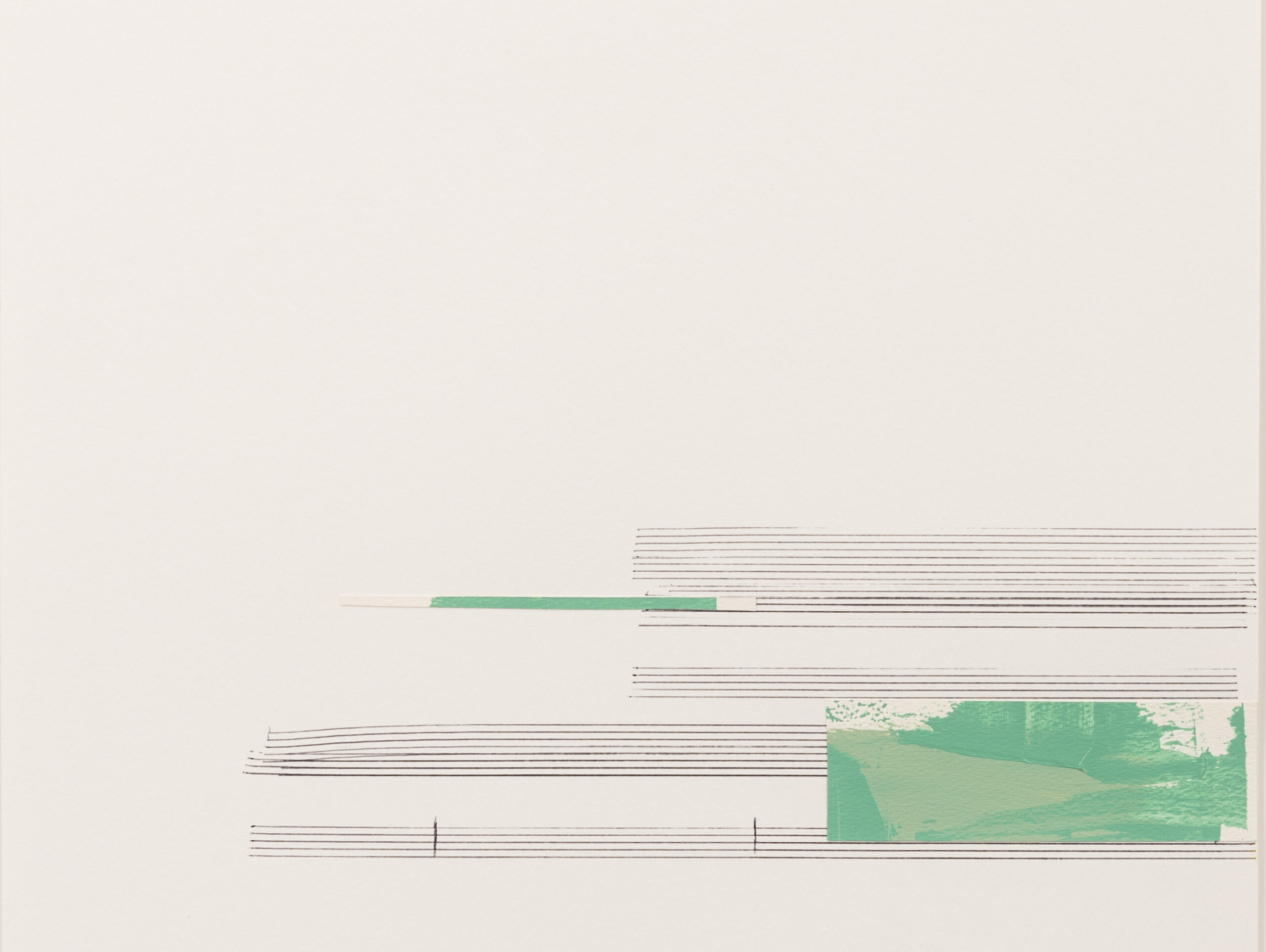 New York-based artist Jennie C. Jones melds visual and sonic traditions and their relationship to the history of minimalist abstraction. Viewing “listening as a conceptual practice,” her work often presents pairings of visual and sound traditions for audiences to consider the interplay between aural environments and the visual experiences. Recent acquisitions include two collages based on a commissioned installation at the Philip Johnson Glass House (1949) and Sculpture Gallery (1970). Phillip Johnson (1906-2005) was a major figure in 20th-century architecture and these two structures are located on the tranquil grounds of his 49-acre property in New Canaan, Connecticut, which is a national historic site. Jones infused the spaces with meditative solfeggio frequencies which gradually change to avant-garde jazz compositions as visitors move through the spaces, reflecting the social and cultural shifts occurring between 1949 and 1970. The collages, in effect, become a visual record of these experiences.
