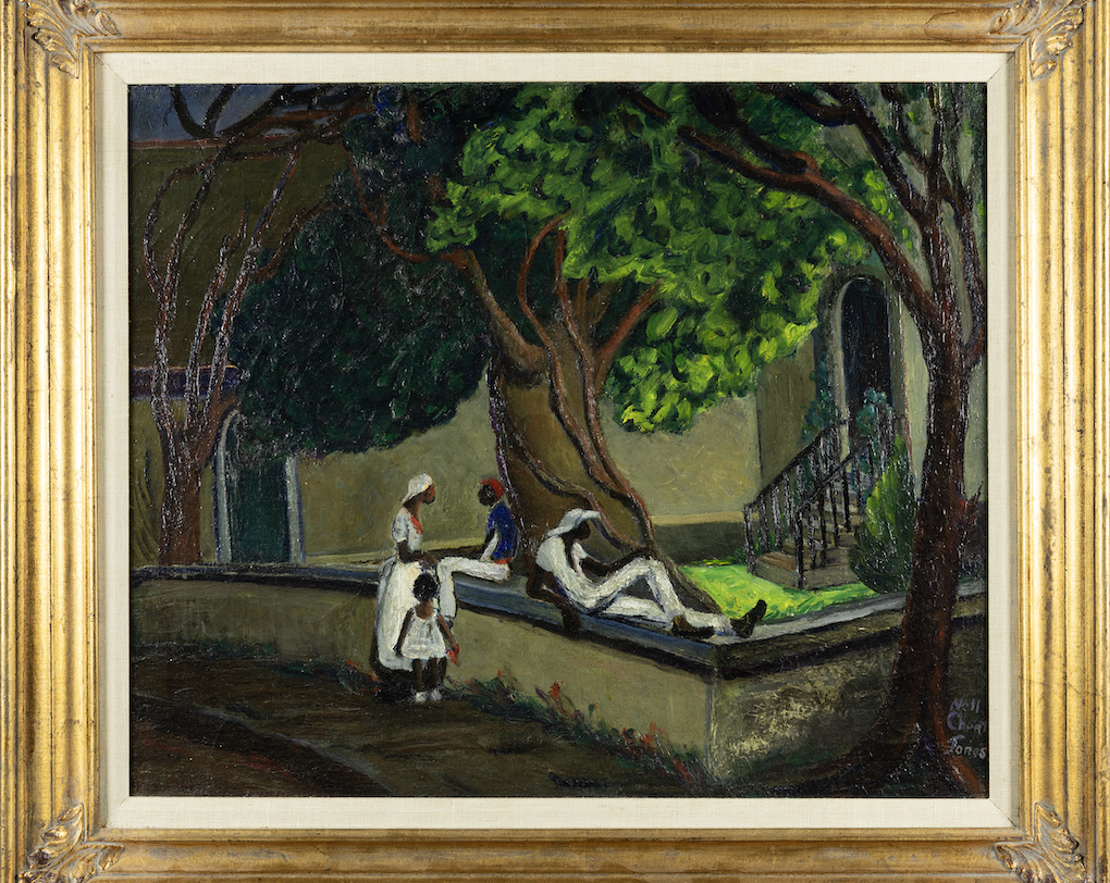 Similarly, Nell Choate Jones was a Georgia native and a leader in organizations that promoted the art of the South, such as the Southern States Arts League and National Association of Women Artists (she became president of the latter). Her oil painting “Square at St. Mary’s” is part of this collection. The painting features four people relaxing around a tree outside of a church, showing community interaction and comradery.