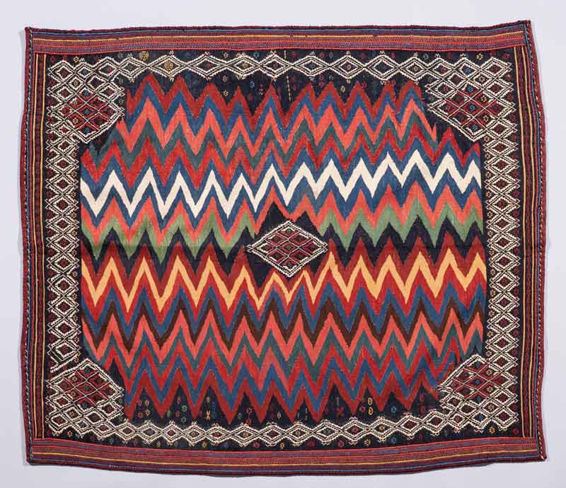 This rug is another weaving that is both highly decorative and functional. It is a flatweave known as a sofreh or eating cloth. It would be laid out on the floor on top of a rug that was the floor covering. Food would be then spread out on the cloth for a family meal. This sofreh is highly decorative. Its vivid field consists of a series of zigzag stripes broken up by a small diamond-shaped center medallion made up of nine smaller diamond medallions. The center medallion is duplicated in the four spandrels. The white border also features a series of triangular medallions, each of which also contains a small center medallion.