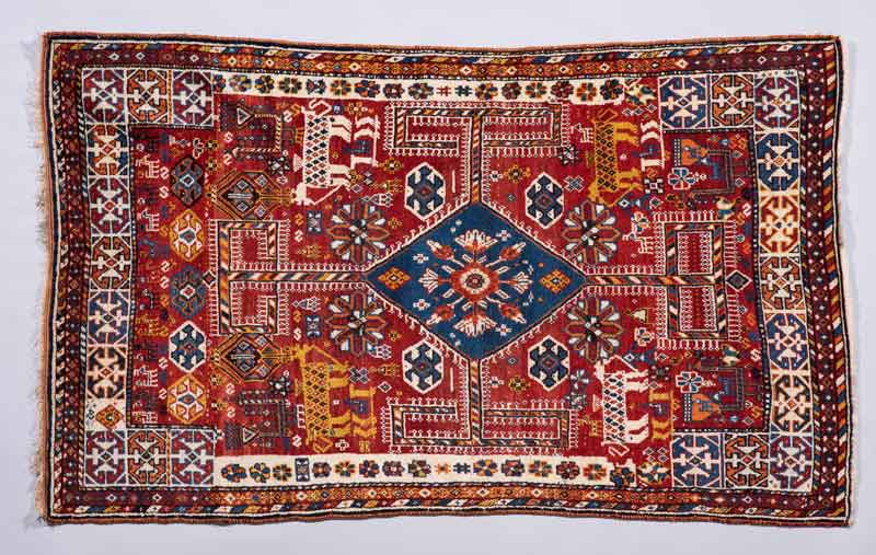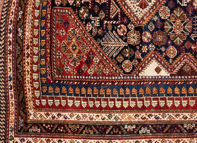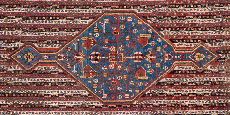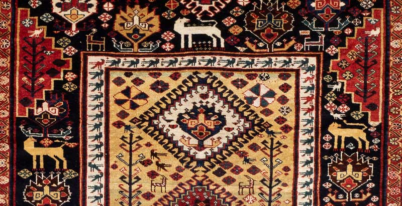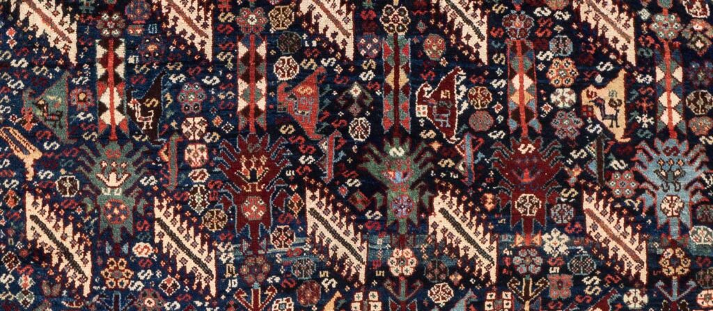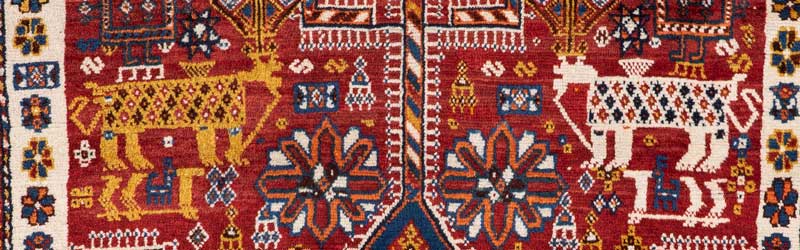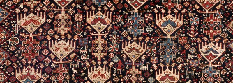 Often, people classify Persian rugs by the city or surrounding area where they were woven (for example, Kashan, Qum, Nain, Bidjar, Heriz). Rugs woven in the broadly defined area known as southwest Persia, however, are usually called tribal rugs and tend to be identified by the tribe or sub-tribe who wove the rugs (for example, Qashqai, Khamseh, Afshar). These rugs tell us something about the area in which they were woven, how the people lived who produced them, and the culture of the area. In short, these examples of tribal textiles tell us stories.