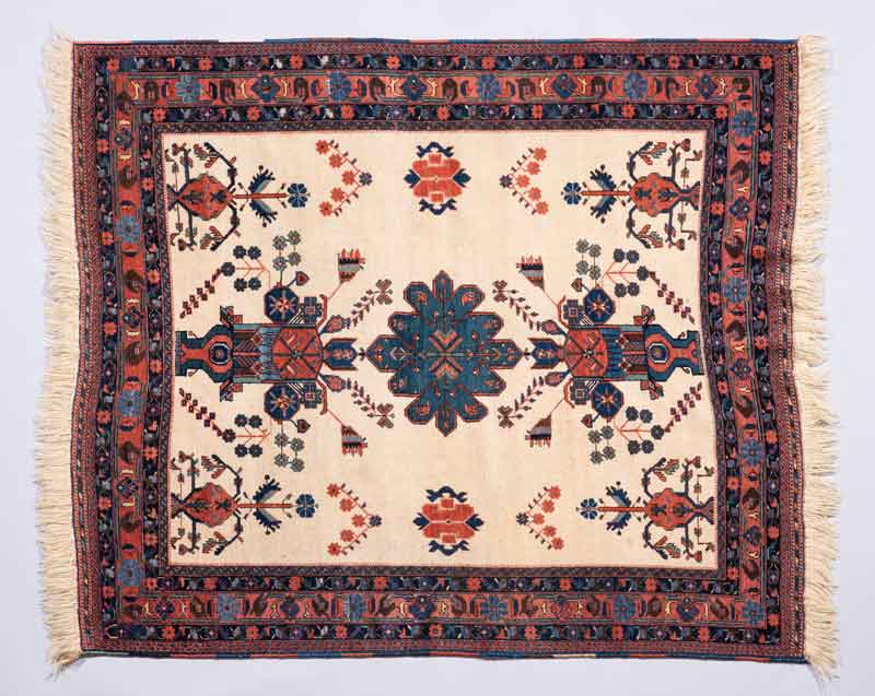 The other two Afshar rugs are white-field Afshars. We include these rugs as a pair for several reasons. First, we know these rugs have never been separated. They were woven as a pair, either by the same weaver who wanted to tell a pictorial story with them or by two weavers, perhaps on side-by-side looms. They have traveled the world together. Second, each rug presents classic field designs set against a white field. The first rug has the well-known vase design. Two large vases are shown both above and below a center 12-sided medallion. Each of the four spandrels also contains a vase design with stylized branches. These motifs also appeared in Kerman city weavings.