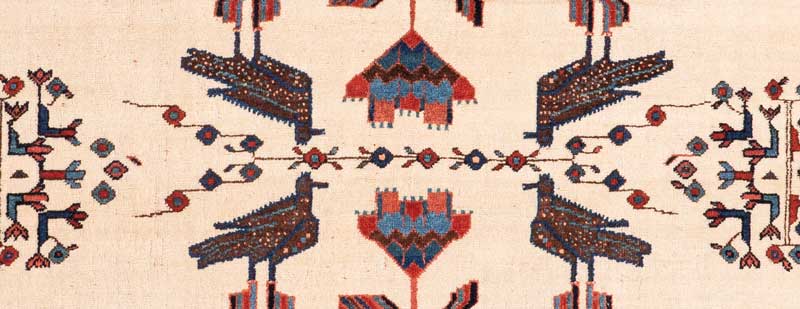 The Qashqai rugs contain an abundance of motifs and symbols within the field designs: animal figures, birds and bird head figures, stylized tree forms and branches, swastika derivatives, rosettes and flower heads, flaming palmettes, checkerboard forms and human figures as well as other elements.
