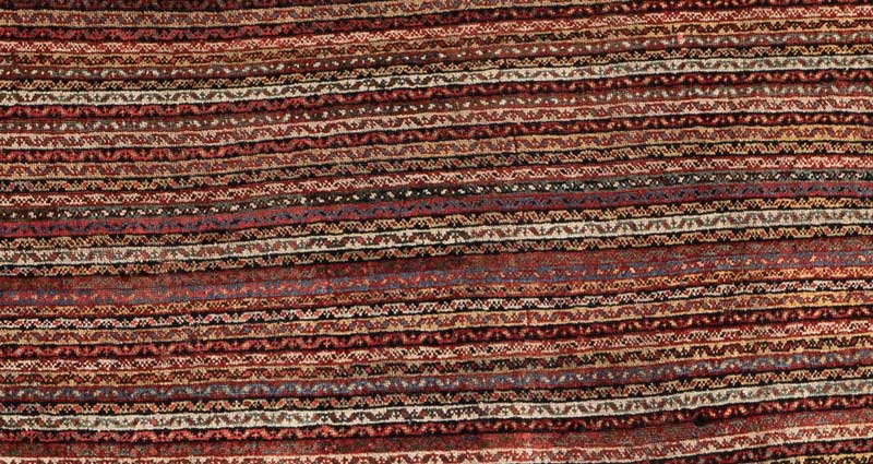 The third Shekarlu rug also has the white border, but its field design is very different and elegant in its simplicity. The repeating series of narrow stripes is known as the “moharamat cane” design. Within each stripe or cane is a series of meandering patterns and colors that add to the uniqueness of the piece. The cane design is likely to be from the Khamseh tribe.