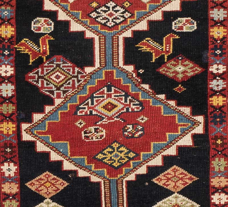 Each of these three rugs has a wide white-ground border consisting of a series of medallions, some diamond-shaped and others hexagonal. Despite slight differences in the shapes of the medallions and the placement of the “bird heads” on the medallions, they are clearly identifiable as having a common origin. The border is one of the most important indicators of a Shekarlu weaving.
