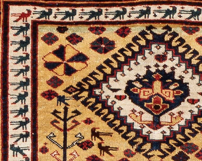 This rug is one of the finest examples of Qashqai weavings. It has two large bird head medallions, one at either end of the rug. The single most distinctive feature of this rug is the central “rug-in-a-rug” design. The inner rug contains three smaller bird head medallions in the center set against a yellow field that has several stylized trees and a variety of animal motifs and assorted small medallion-like elements. If you look closely at the very orderly inner border consisting of a series of green birds, you can see red birds, too. A single green bird points in the opposite direction of the others.