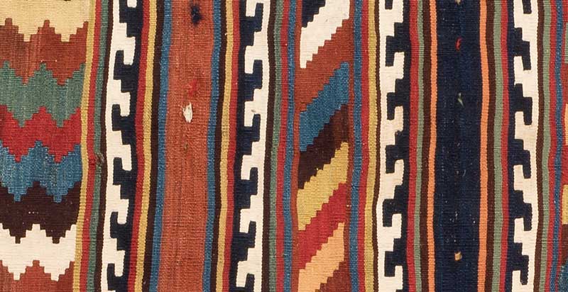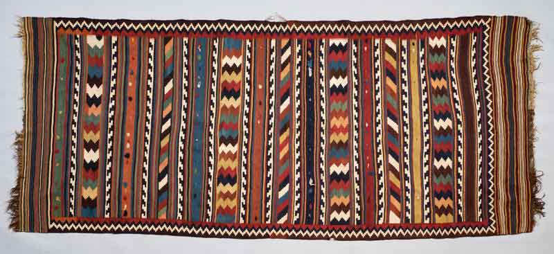 These long and narrow kilims were not woven for floor coverings but to cover piles of sacks that stored grain or to cover other woven pieces (known as mafrashes) that stored clothing, bedding, and other household items. The kilims provided color within what were known as “the black tents” of the nomadic tribes. Given the high quality of this example, it may have been woven for someone highly ranked in the tribal system.