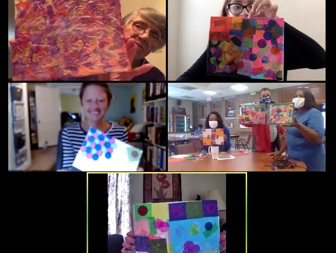 For the new format, the museum prepared kits that participants would be able to use at their facilities. The kits include a full-color brochure that shares information about works of art, instructions to complete a related art activity and a nice set of art supplies. Kincaid collaborated with Athens Community Council on Aging (ACCA) on a recent Creative Aging program. For the month of October, seniors explored the exhibition “Carl Holty: Romantic Modernist.” The kits included information about Carl Holty and close-looking prompts for three works of art in the exhibition. The art activity was a tissue paper collage on canvas. ACCA’s Allyn Rippin, director of the Center for Active Living, hosted a Zoom meeting so participants could explore Holty’s art and create together.