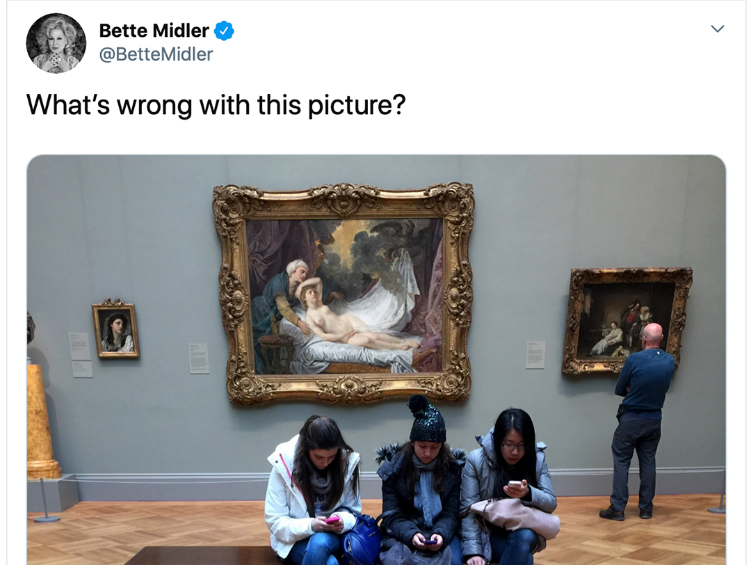 That said, nobody is correct all the time. On December 8 Ms. Midler tweeted a picture of three young women seated on a bench in a gallery of the Metropolitan Museum of Art, all three staring at their phones and seemingly ignoring the art on the wall. “What’s wrong with this picture?” the tweet exclaimed.